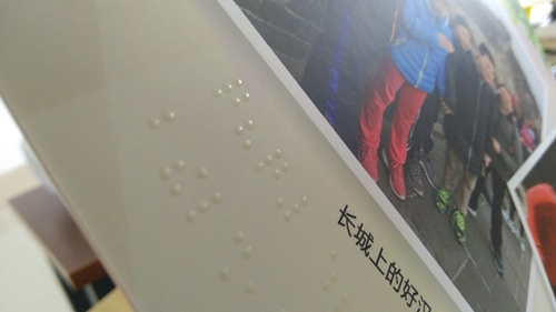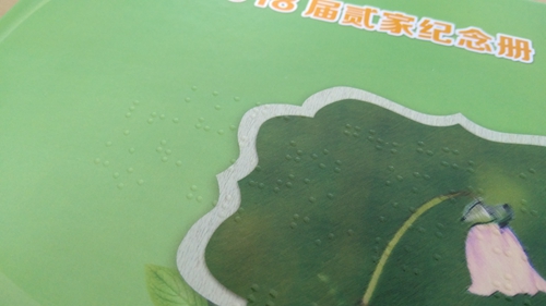 一個架子上,放著一疊厚實的精裝冊子,封面寫著“2018屆貳家紀(jì)念冊”。翻開冊子,與以往見到的一樣,紙面印著一張張燦爛而純真的笑臉和一些文字,不一樣的是,紙面上還多了一些微微凸起圓點,大約厚度1mm左右,按一種特有的規(guī)律排列,看起來晶瑩剔透,用手撫摸一下,顆粒感很真實,這就是“盲文畢業(yè)紀(jì)念冊”。